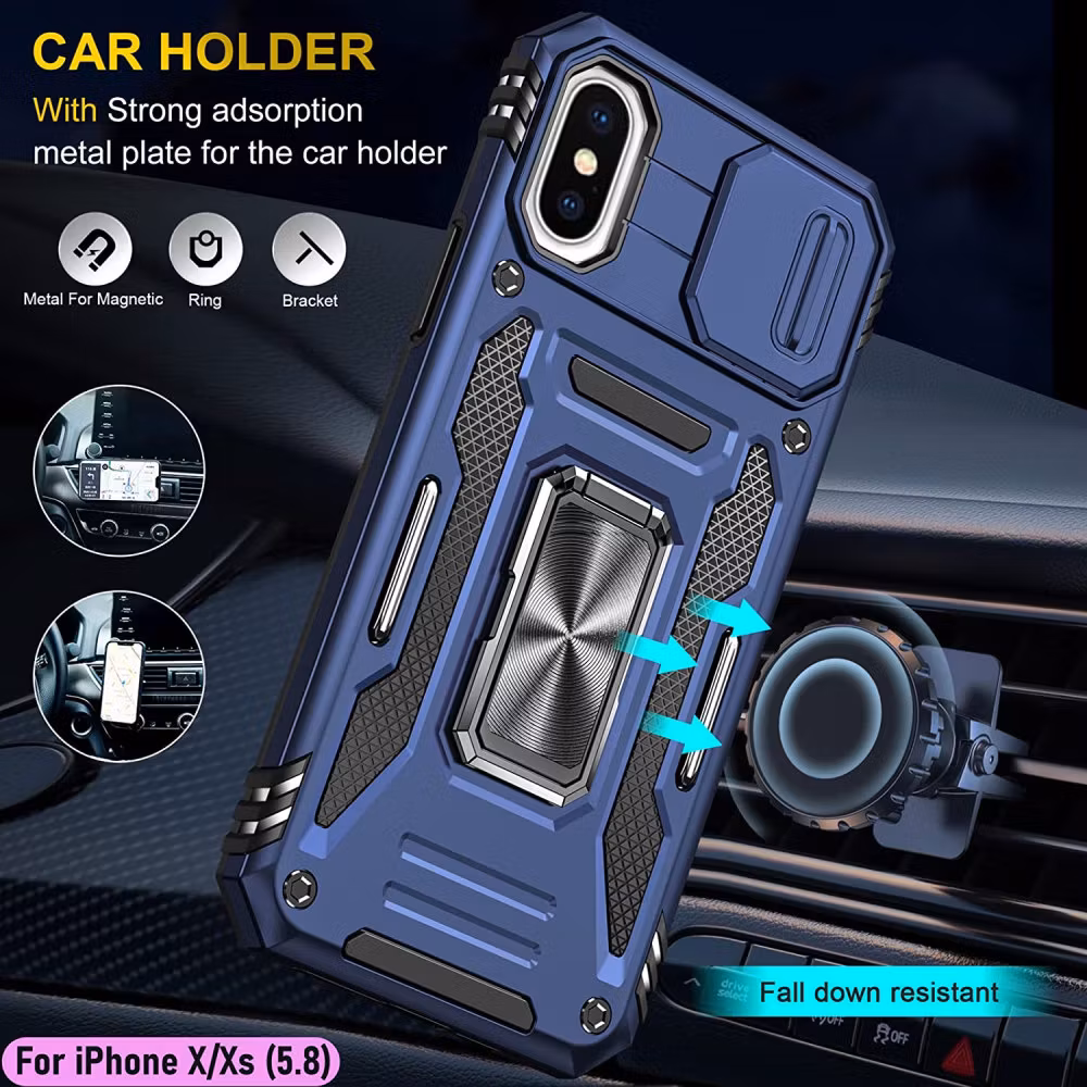 Stöttåligt skal med kameraskydd och förstärkta hörn som passar perfekt till Apple iPhone X/XS. Skyddar din mobil effektivt mot skador. repor och smuts. Inbyggd magnetiskt ring som praktiskt kan bilda mobilställ samt gör det lättare att bära och hålla mobilen. Det perfekta skalet till dig som önskar skydda mobilen väl men samtidigt behålla en snygg design som är lätt att bära.