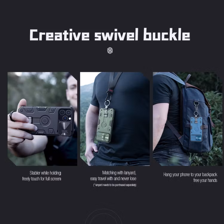 Snyggt mobilskal med kameraskydd till Apple iPhone 13 Pro Max från Nillkin. Inbyggd lucka som enkelt skjuts framför kameran och på så sätt skyddar effektivt mot repor och skador som lätt kan bli på kameralinsen. Kameraskyddet är tillverkat i borstat stål.