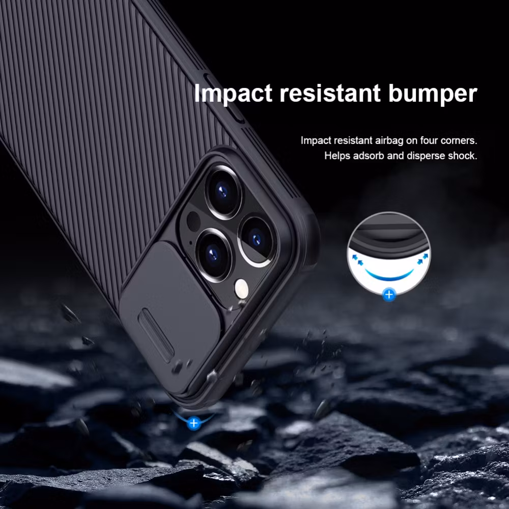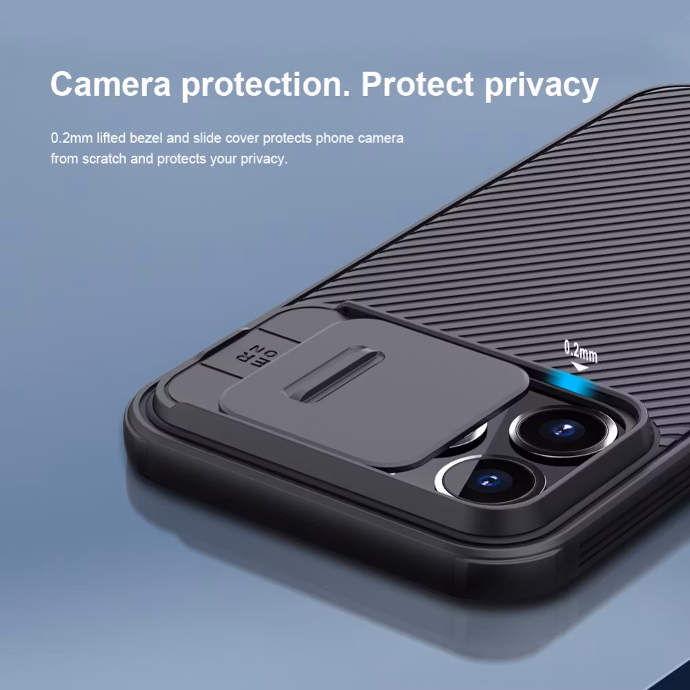Snyggt mobilskal med kameraskydd till Apple iPhone 13 Pro från Nillkin. Inbyggd lucka som enkelt skjuts framför kameran och på så sätt skyddar effektivt mot repor och skador som lätt kan bli på kameralinsen. Skalet är tillverkat i stötdämpande TPU runt om och baksidan i hård polykarbonat för effektivt skydd av telefonen mot stötar och skador.