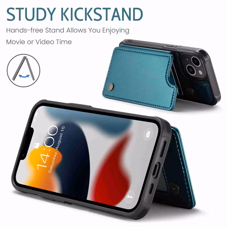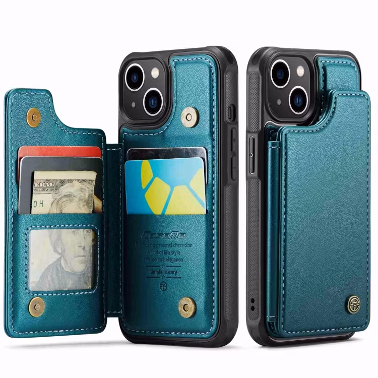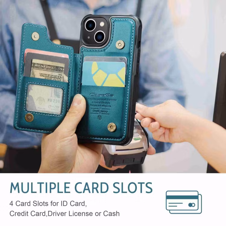Slimmat Premium Läderskal med kortfack från CaseMe® för upp till 4 kort som passar Apple iPhone 13. Ett premium skal som är RFID skyddat, dvs skyddar din mobil och dina betalkort mot så kallad skimming så att ingen kan avläsa din information.