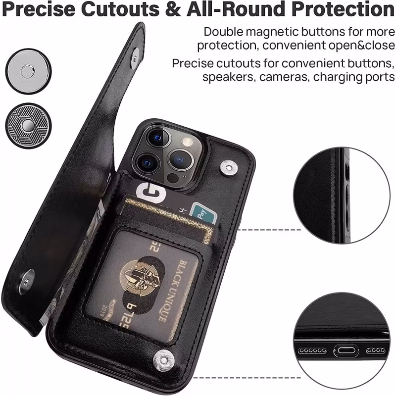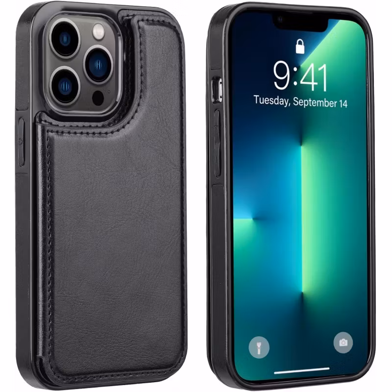Slimmat och elegant Läderskal med kortfack för upp till 3 kort som passar Apple iPhone 14 Pro Max. Stötdämpande med förstärkta hörn som skyddar din mobil mot repor och skador. Upphöjda kanter som motverkar repor på skärmen och kameran om mobilen placeras med skärmen nedåt.