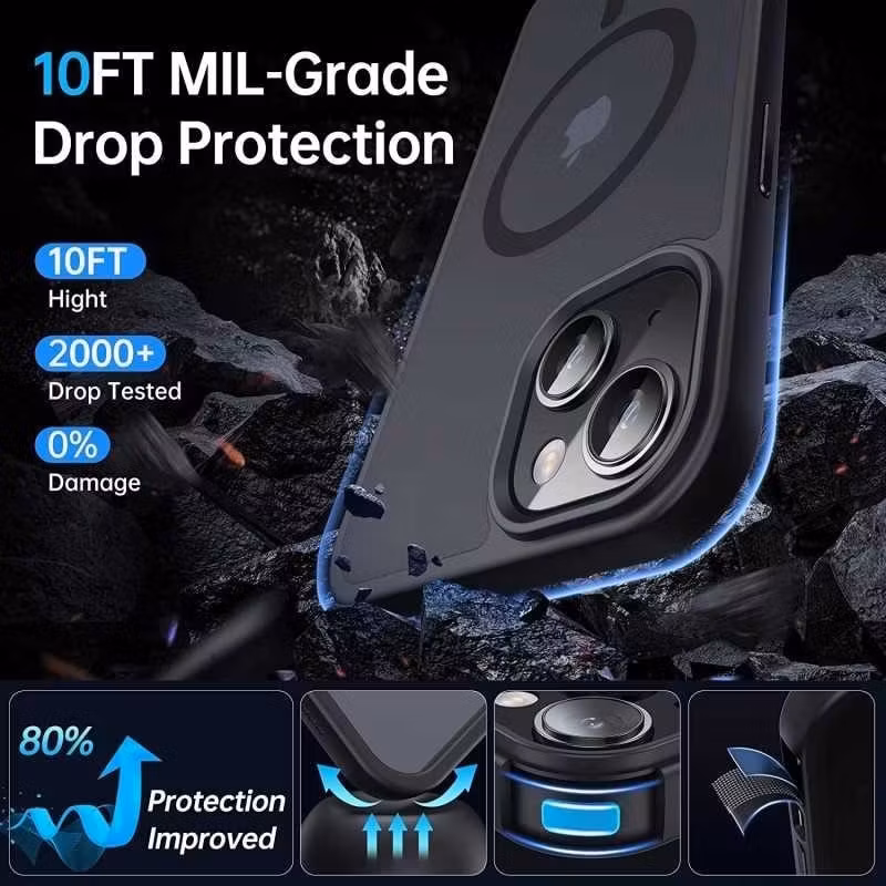 De fyra hörnen på skalet är konstruerade som en elastisk buffert som effektivt kan distribuera och därmed dämpa kraften från stötar, vilket skyddar din telefon från skador vid exempelvis fall. Hörnen sticker också ut på baksidan för att baksidan av skalet inte ska repas.