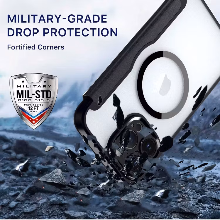 Uppfyller militära fall test standard (MIL STD 810G-516.6), klarar av 26 fall från 4 meter höjd Patenterade CornerGuard™ -tekniken ser till att alla fyra hörnen av höljet är utformade för att absorbera och sprida kraft från fallen. Fodralet har upphöjda kanter som förhindrar att skärmen kommer i kontakt med en plan yta om telefon placeras med skärmen nedåt.