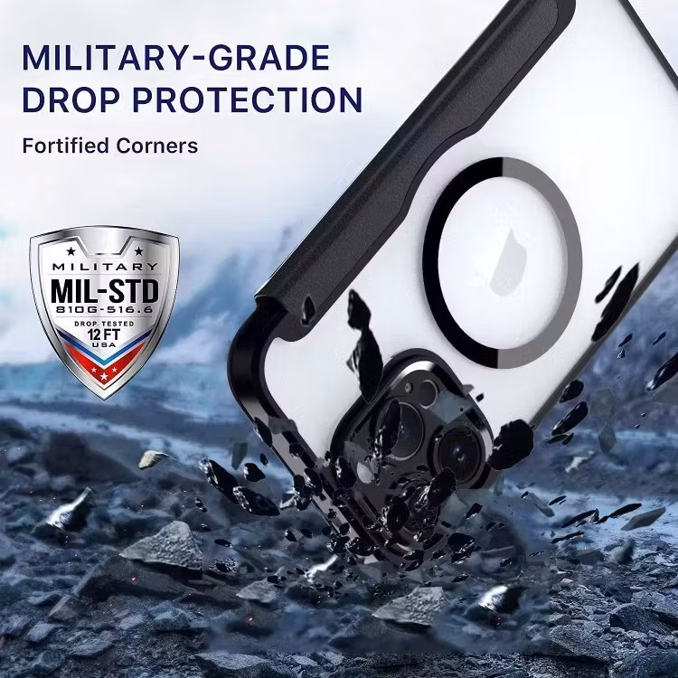 Uppfyller militära fall test standard (MIL STD 810G-516.6), klarar av 26 fall från 4 meter höjd Patenterade CornerGuard™ -tekniken ser till att alla fyra hörnen av höljet är utformade för att absorbera och sprida kraft från fallen. Fodralet har upphöjda kanter som förhindrar att skärmen kommer i kontakt med en plan yta om telefon placeras med skärmen nedåt.