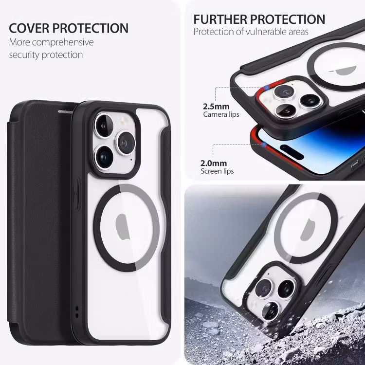 Premium läderfodral med kortfack och en magnetisk hållare som har en perfekt balans mellan design, känsla och säkerhet från alla håll på din iPhone 15 Pro Max.