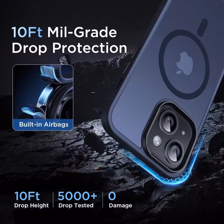 De fyra hörnen på skalet är konstruerade som en elastisk buffert som effektivt kan distribuera och därmed dämpa kraften från stötar, vilket skyddar din telefon från skador vid exempelvis fall. Hörnen sticker också ut på baksidan för att baksidan av skalet inte ska repas.