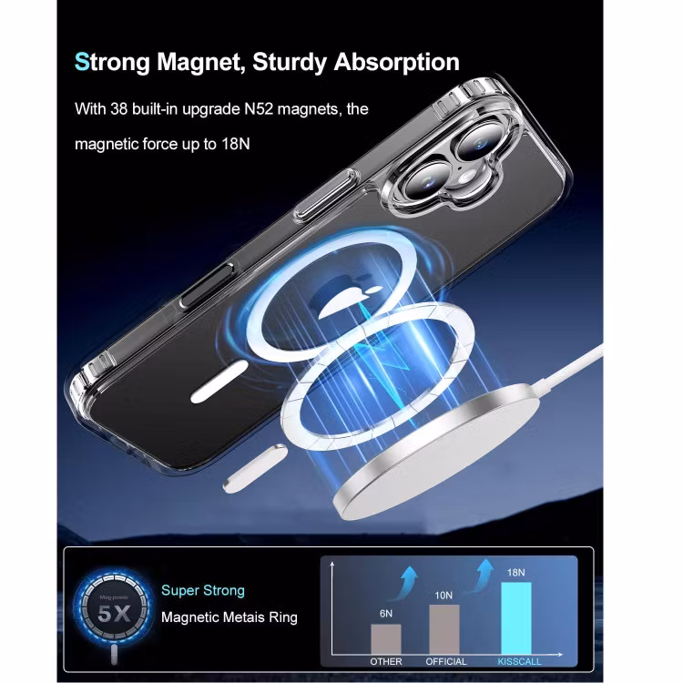 Detta skal har också inbyggda magneter för att du ska kunna ladda din iPhone med MagSafe-laddaren, eller använda andra MagSafe-tillbehör såsom till exempel korthållare. De starka magneterna ser till att hålla laddare och andra tillbehör stadigt på plats. MagSafe-laddarens och andra trådlösa laddares signaler påverkas inte av skalet.