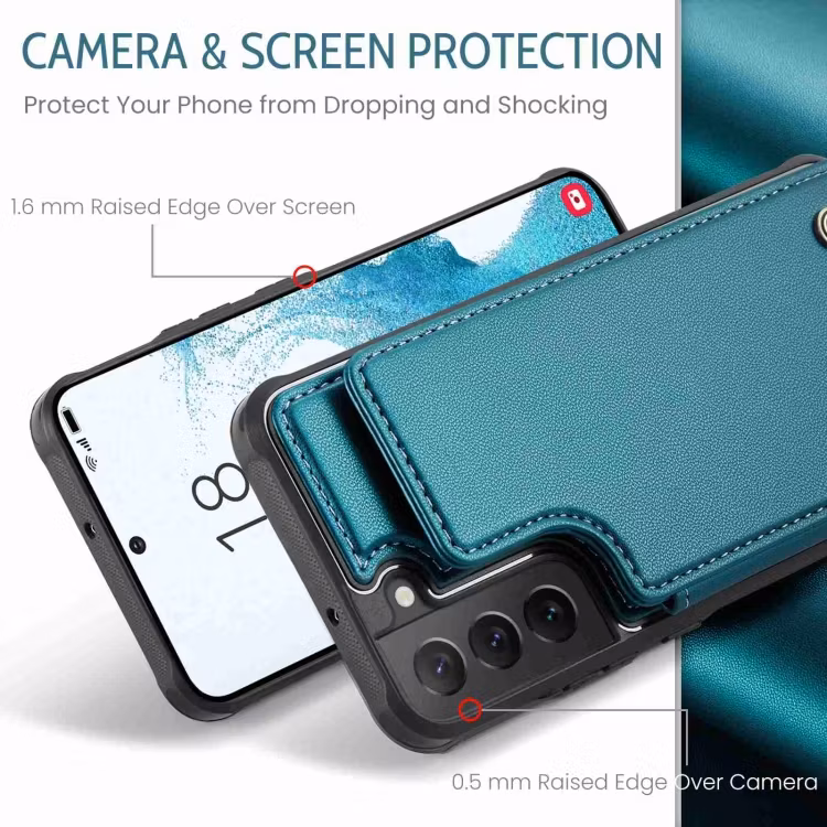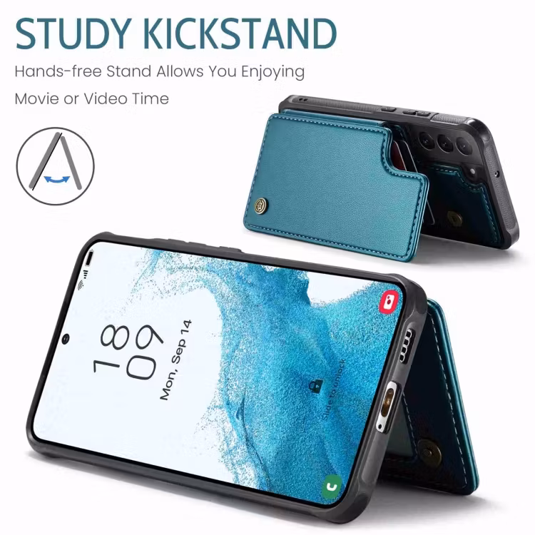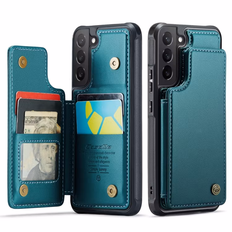 Slimmat Premium Läderskal med kortfack från CaseMe® för upp till 4 kort som passar Samung Galaxy S22. Ett premium skal som är RFID skyddat, dvs skyddar din mobil och dina betalkort mot så kallad skimming så att ingen kan avläsa din information.