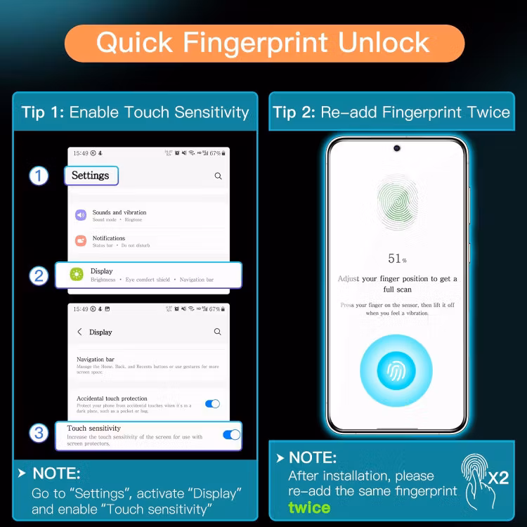 Detta skärmskydd funkar med fingeravtrycksläsaren. men det är viktigt att Ni registrerar om fingeravtrycksläsaren efter installationen så att allt fungerar optimalt.