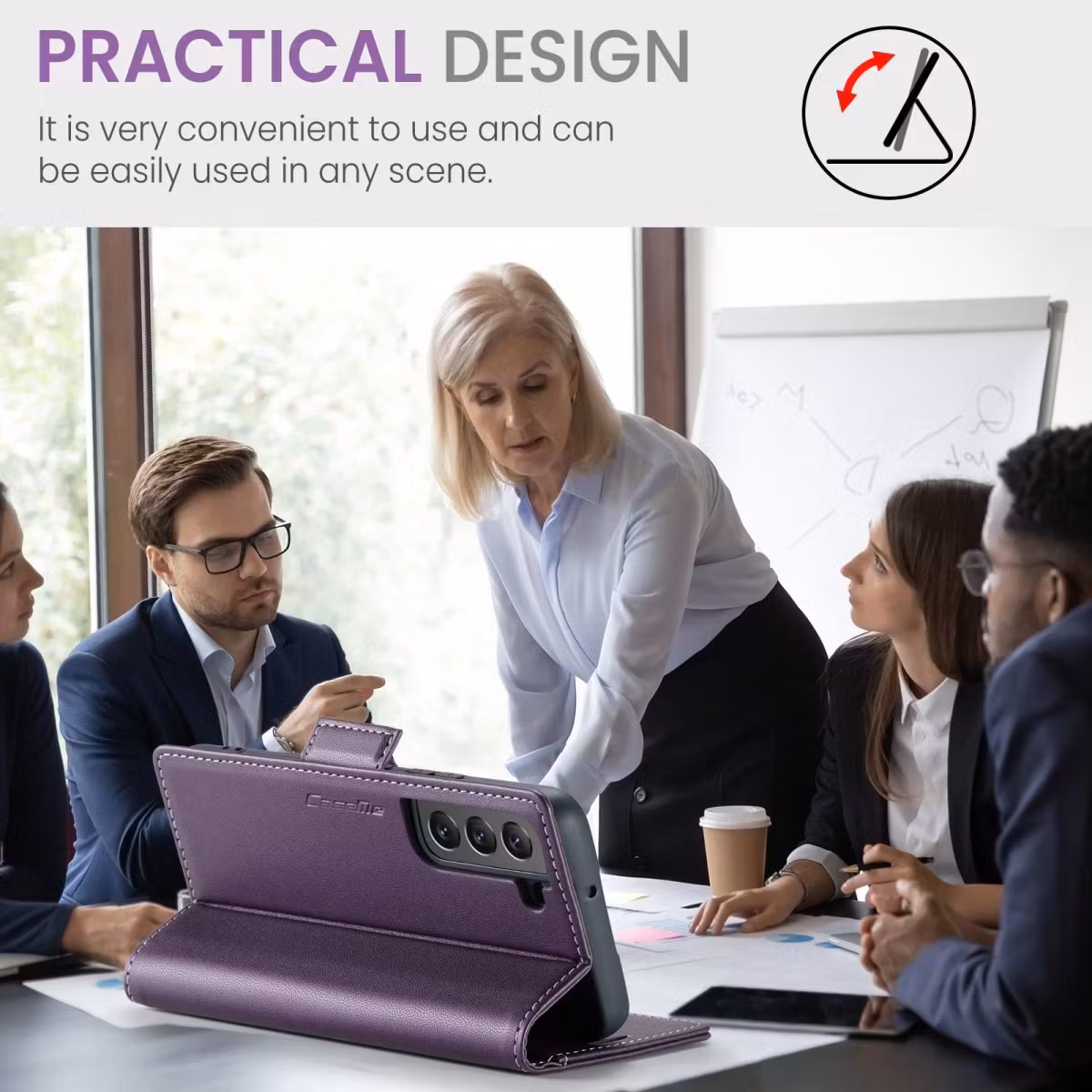 Praktiskt plånboksfodral med kortfack och sedelficka från CaseMe som passar Samsung Galaxy S24. Ett fodral som är RFID Skyddat, dvs skyddar din mobil och betalkort mot så kallad skimmning så att ingen kan avläsa din information.