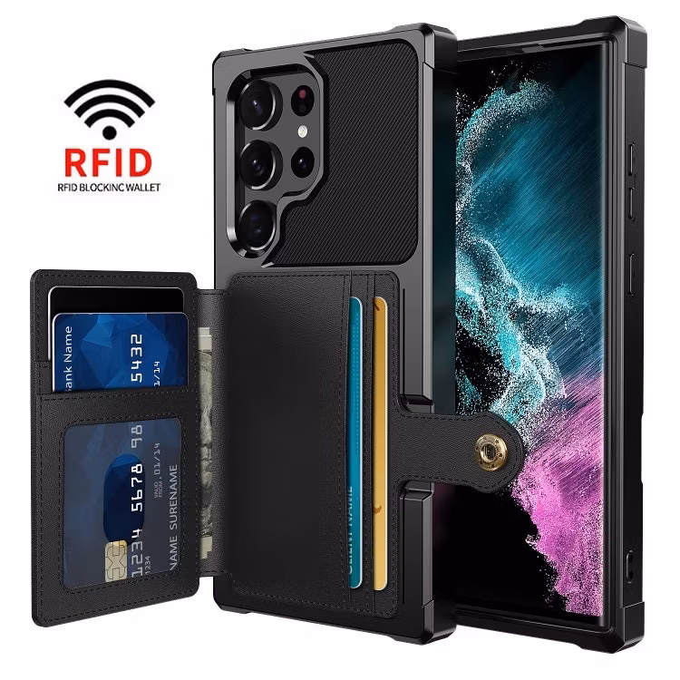 Mobilskal med korthållare för upp till 5 kort som passar Samsung Galaxy S22 Ultra. Stötdämpande med förstärkta hörn som skyddar din mobil mot repor och skador. RFID Skyddat skal som ger din mobil och kort maximalt skydd mot så kallad skimming.